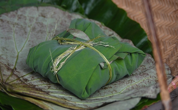 Cốm tươi thường được gói tỉ mẩn qua hai lớp lá, lớp lá ráy bên trong giúp giữ hạt cốm không bị khô và phai màu, bên ngoài được bọc thêm lớp lá sen để không mất đi hương cốm. Người bán còn khéo léo cột hờ cọng rơm vàng còn vương mùi lúa. Mùi lá sen tươi quyện với mùi cốm mới, hương lúa non hòa cùng hương sen dìu dịu tạo nên mùi vị rất riêng, đậm đà hương đồng gió nội.