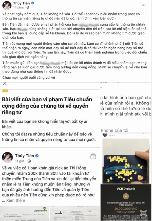 Tuy nhiên, cộng đồng mạng đã nhanh chóng chỉ ra Thuỷ Tiên đã có sự nhầm lẫn, bởi số được in trong chứng từ giao dịch là số thẻ chứ không phải số tài khoản như nữ ca sĩ đã đề cập. Ngay sau đó, bài đăng này của Thuỷ Tiên đã biến mất.