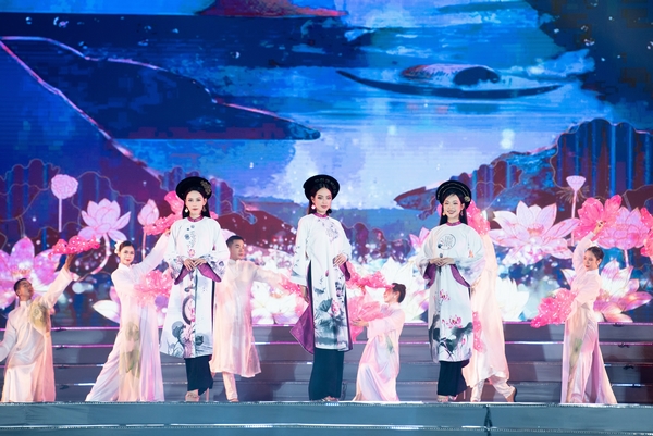 Sân khấu của lễ bế mạc trở nên lung linh và quyến rũ hơn bao giờ hết khi các nàng hậu đều mang một phong cách trình diễn riêng với thần thái ngút ngàn trong những bộ áo dài và hoạ tiết hoa sen độc đáo.