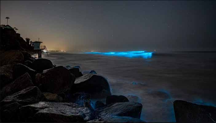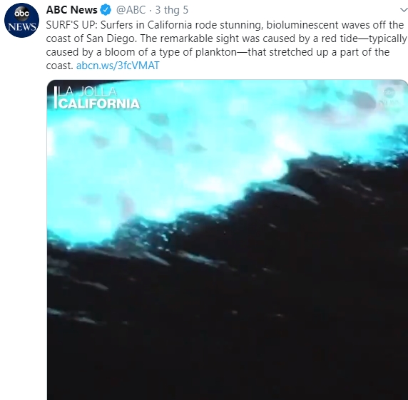 Từ cuối tháng 4 đến đầu tháng 5, nhiều bãi biển từ Los Angeles của Mỹ tới tận Baja California của Mexico đều bỗng nhiên phát sáng màu xanh neon kỳ ảo vào ban đêm. Theo các chuyên gia, đây là hiện tượng "thủy triều đỏ" và phát quang sinh học do loài tảo biển siêu nhỏ Lingulodinium polyedra nở hoa. Tin, bài liên quan: Hiện tượng hiếm gặp: Bãi biển phát sáng màu xanh neon Tảo xanh độc hại đe dọa nguồn cá của nhiều nước châu Á Những bức ảnh Trái đất bị tàn phá, rúng động người xem
