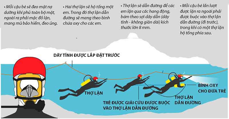 – Ngày 7-7: Chiến dịch giải cứu được ưu tiên phương án “dạy các em lặn để đưa các em ra ngoài” khi thời tiết không có dấu hiệu giảm mưa lũ và nồng độ ôxy trong hang giảm mạnh đến mức báo động.