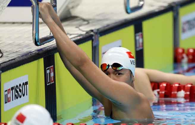 Ánh Viên khá đuối sức so với các đối thủ ngay từ khi xuất phát, HLV cho biết đây có thể là do “cảm giác nước không tốt”, càng dần “tiểu tiên cá” càng rối, khiến thành tích không được như mong đợi. Ánh Viên là niềm hy vọng săn huy chương của đoàn thể thao Việt Nam, dù rất cố gắng, Ánh Viên chỉ có thể về đích thứ 5. Ánh mắt thất thần của cô sau khi kết thúc phần thi khiến người hâm mộ có mặt tại sân không khỏi xót xa.
