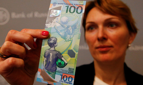 Tờ100 rúp được RCB phát hành hồi tháng trước, để kỷ niệm lần đầu quốc gia này tổ chức một kỳ World Cup. Tờ tiền này không chỉ để làm kỷ niệm mà còn có giá trị lưu hành. Tờ 100 rúp nổi bật với hình ảnh một cậu bé đứng nhìn pha bay người cản phá của thủ môn huyền thoại Lev Yashin tuyển Liên Xô cũ.