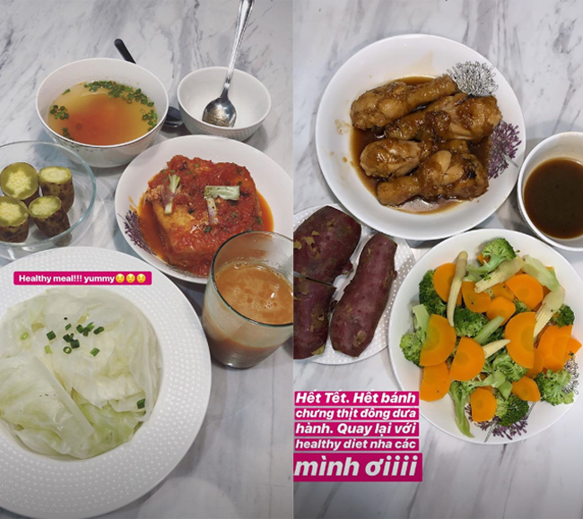 Tóc Tiên ăn đầy đủ các nhóm thực phẩm nhưng thay thế cơm trắng bằng khoai lang nhằm hạn chế lượng tinh bột nạp vào cơ thể.