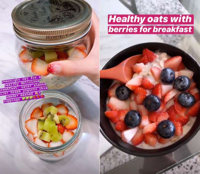 Nữ ca sĩ thường ăn kèm cùng các loại rau xanh như dưa leo, cà chua, trái bơ… và các thực phẩm giàu protein như trứng luộc, ức gà nhằm giữ cơ săn chắc. Yến mạch cũng là món ăn khá được lòng giọng ca sinh năm 1989. Cô thường chuẩn bị sẵn món yến mạch qua đêm (overnight oat) cho bữa sáng và ăn kèm các loại trái cây tươi như kiwi, dâu tây. Bữa sáng với yến mạch và trái cây tươi giúp cung cấp đủ chất xơ, vitamin… cho ngày mới, đây cũng là món ăn thường được các siêu mẫu áp dụng nhằm giảm cân, giữ dáng.