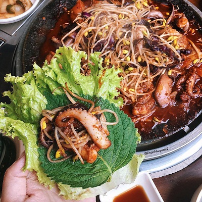 Không ăn thịt nướng được cùng hội bạn thì thôi mình gọi một chảo bạch tuộc xào cay để bù lấp cũng được.