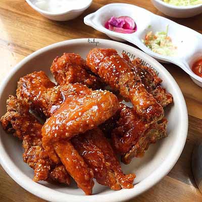 Gà sốt cay với phần vỏ ngoài giòn tan thấm đẫm cùng hương vị sốt cay cực cuốn hút. Từng miếng gà mềm thơm nhưng lại dậy lên mùi sốt đậm đà và một vài lát ớt cay bám trên những miếng gà.