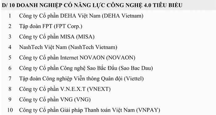 Các doanh nghiệp được điểm tên trong top 10 gồm: DEHA Việt Nam, Tập đoàn FPT, Công ty cổ phần MISA, Nashtech Việt Nam, NOVAON, Công ty Cổ phần Công nghệ Sao Bắc Đẩu, Tập đoàn Công nghiệp viễn thông Quân đội (Viettel), Công ty Cổ phần V.N.E.X.T, Công ty cổ phần VNG và Công ty Cổ phần Giải pháp Thanh toán Việt Nam (VNPAY).