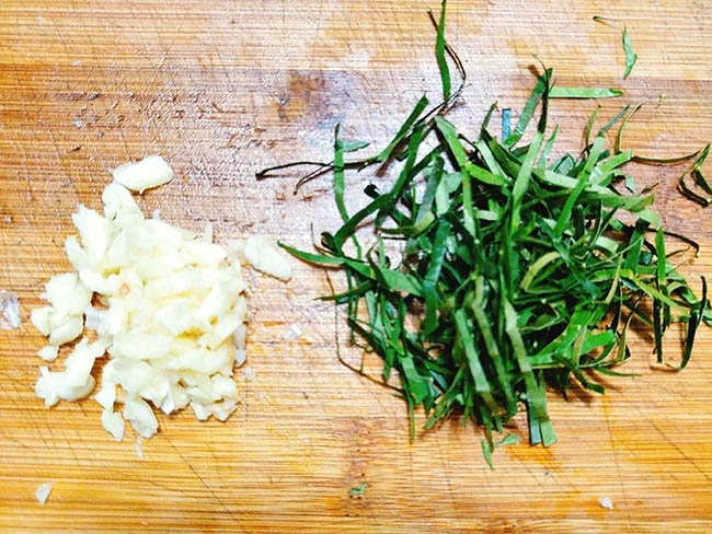 Tỏi bóc vỏ băm nhỏ, lá chanh rửa sạch rồi thái chỉ.