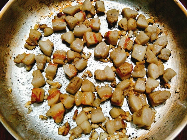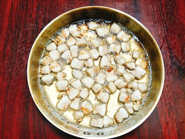 Cho mỡ lợn vào chảo và bật bếp rang cho mỡ ra nước, co lại thành tóp là được, vớt tóp mỡ ra và chắt hết phần nước mỡ ra bát, chỉ để lại khoảng 1 thìa mỡ nước trong chảo.