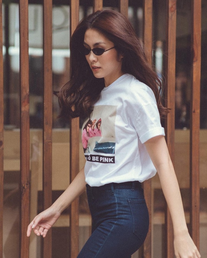Không cần cầu kì mà chi, chỉ diện bộ đôi trang phục ai ai cũng có: Áo phông và quần jeans ôm, thêm kính mát bản nhỏ làm duyên là Tăng Thanh Hà đã trở nên nổi bật.