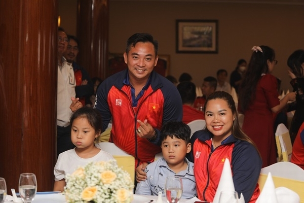 VĐV Nguyễn Thị Hải cùng gia đình tham gia lễ tuyên dương (Ảnh: Hà Phương)