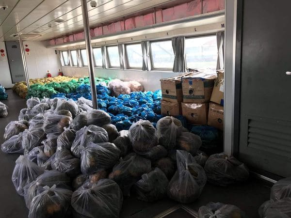 Rau và hàng cứu trợ được chuyển bằng tàu cao tốc.