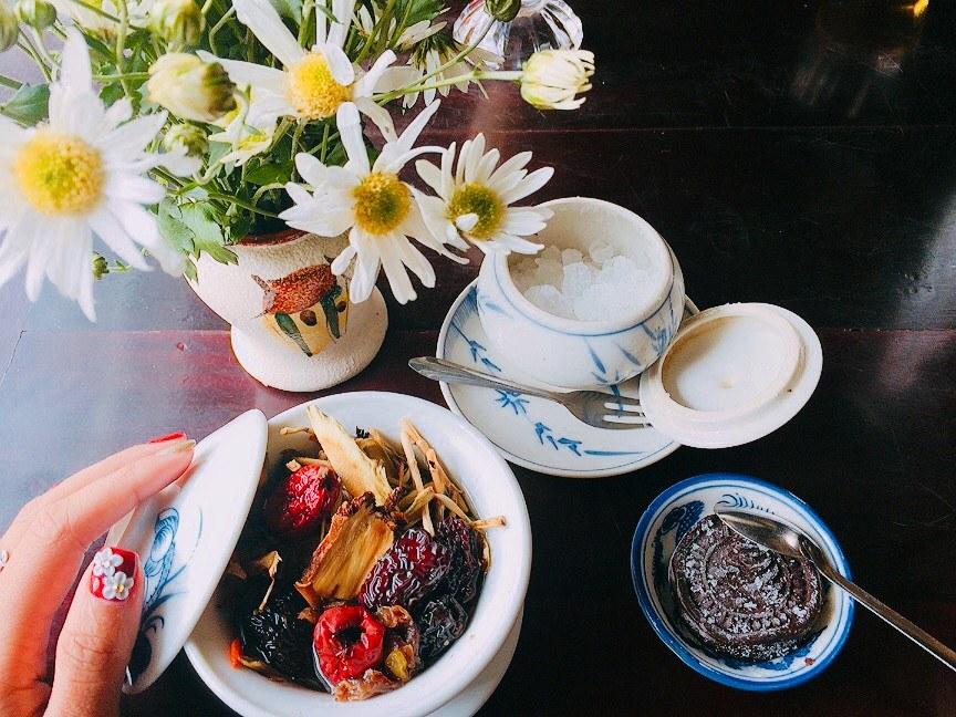 Trà cung đình là món thức uống thơm ngon, bồi dưỡng được tạo nên từ các các vật liệu khác nhau. Một số trà đa dạng có thể kể tới như: trà atiso đỏ, trà hoa cúc vàng, trà hoa nhài thơm nồng hay trà mướp đắng… Trà cung đình còn được tạo nên từ những loại dược liệu quý như: củ mài, đảng sâm, đại táo, cam thảo, kỷ tử, tim sen. Chính vì các nguyên liệu tạo nên món ngon của Huế này đều với căn nguyên từ thiên nhiên nên trà cung đình cực tốt cho sức khỏe.