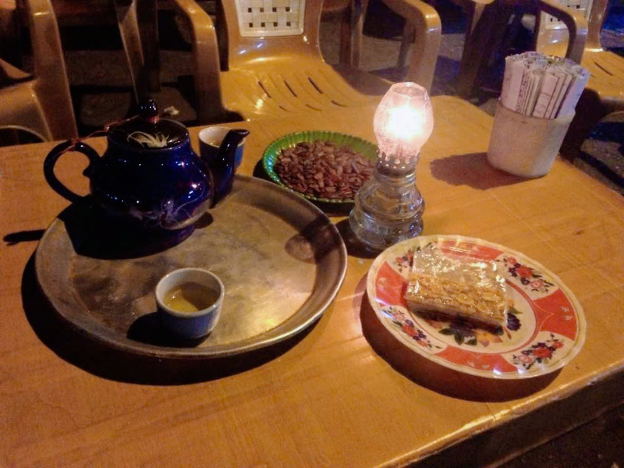 Dưới ánh đèn leo lắt của ngọn đèn dầu lúc mờ lúc tỏ, vài ba chiếc bàn được dựng ra, thêm vài cái ghế đẩu, một tách trà, một đĩa hướng dương, một cái ống điếu cày và dăm bao thuốc lào là mở ra một quán hàng giản dị, đơn sơ, mộc mạc nhưng thu hút bao nhiêu người dừng chân lại ghé thăm.