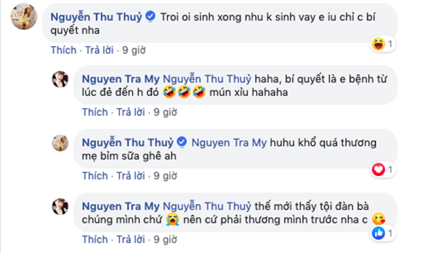 Nữ ca sĩ Thu Thủy cảm thán: “Trời ơi sinh xong như không sinh vậy, em yêu chỉ chị bí quyết nha”. Nhiều bạn bè của Trà My Idol cũng tấm tắc dành lời khen: “Em bé bụ bẫm mà mẹ lại mi nhon, dáng mẹ xinh quá xinh luôn”, “Eo ót ngon lành”, “Chị My cho em bí kíp về người nhanh đi huhu thế này mới có động lực đẻ chứ”…