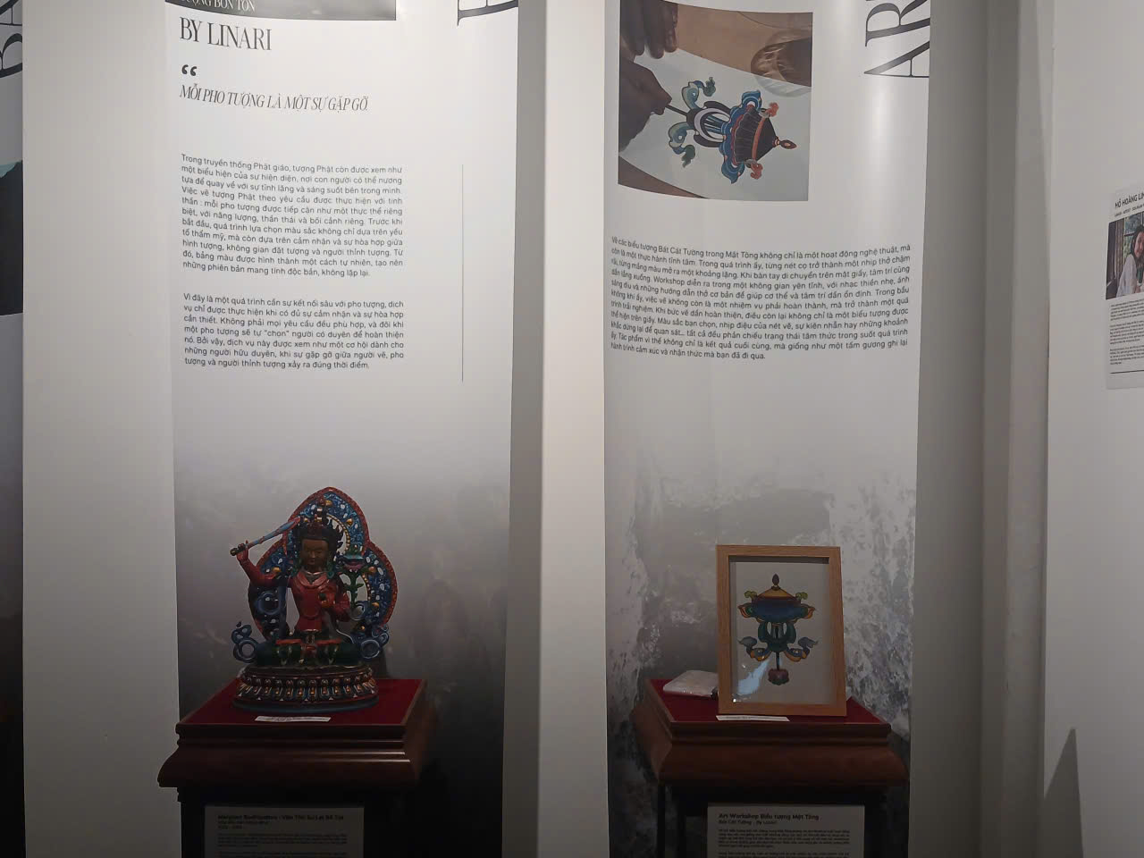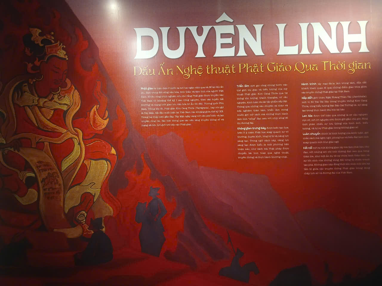 Không gian trưng bày đưa người xem bước vào thế giới biểu tượng của Phật giáo Kim Cang Thừa với hệ thống tôn tượng, tranh thangka, cờ cầu nguyện, kinh luân cùng các tác phẩm sắp đặt đương đại. Qua đó, hành trình phát triển của dòng Phật giáo này được tái hiện từ vùng Hy Mã Lạp Sơn đến quá trình bản địa hóa tại Việt Nam, cho thấy sự giao thoa giữa truyền thống và đời sống hiện đại.