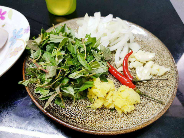 – Rau răm rửa sạch thái nhỏ. Ớt, tỏi rửa sạch đập dập, bằm nhỏ.
