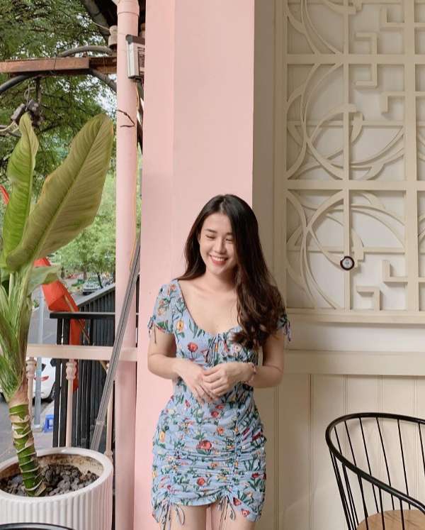 Chiếc váy liền dây rút họa tiết hoa lá mà Ngọc Thảo lựa chọn mang lại cho cô nàng vẻ trẻ trung nhưng không kém phần gợi cảm.