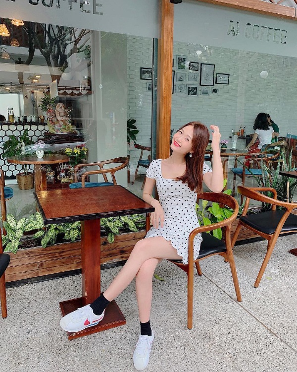 Cũng lăng xê kiểu họa tiết cổ điển này nhưng Nhung Gumiho lại ưu ái thiết kế mang sắc trắng tinh khôi. Cô nàng kết hợp ăn ý trang phục với sneakers khỏe khoắn.
