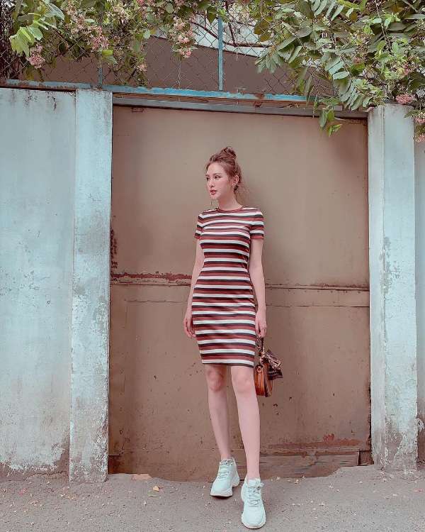 Kelly Nguyễn yêu thích họa tiết kẻ ngang khi lựa chọn cho mình một thiết kế đầm liền ôm sát trẻ trung, tôn dáng và kết hợp item này cùng sneakers khỏe khoắn.