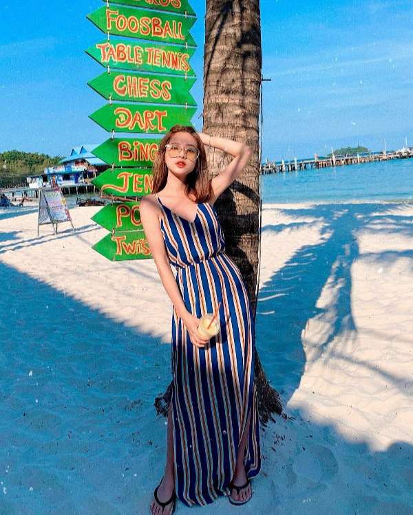 Trong chuyến đi biển gần đây, Mai Anh đã lựa chọn cho mình một chiếc đầm maxi họa tiết kẻ sọc khá duyên dáng.