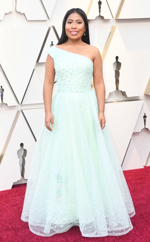 Yalitza Aparicio thanh lịch tại Oscar năm nay với chiếc đầm xoè lệch vai duyên dáng màu xanh lơ. Cô nhận được đề cử Nữ diễn viên chính xuất sắc nhất với vai diễn trong phim Roma.