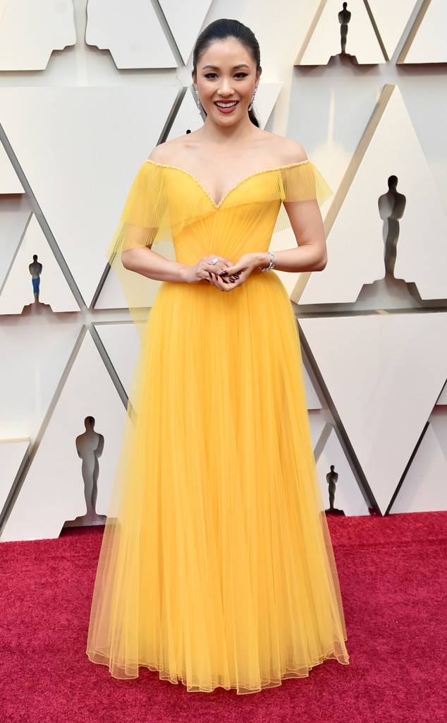 Constance Wu thanh lịch nhưng không kém phần hút mắt với thiết kế màu vàng ngọt ngào của Versace được thực hiện trên nền chất liệu mềm, rũ. Cô cũng nhận được 1 đề cử tại Oscar 2019 này.