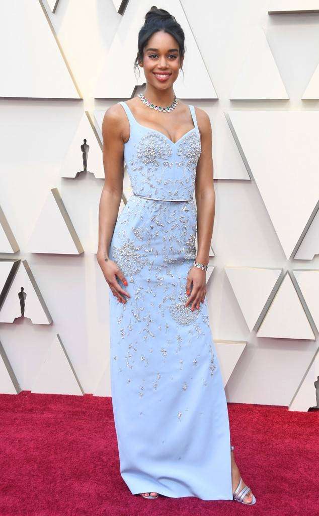 Nữ diễn viên Laura Harrier trẻ trung, quyến rũ với thiết kế màu xanh nhạt kết hợp chi tiết đính kết của Louis Vuitton