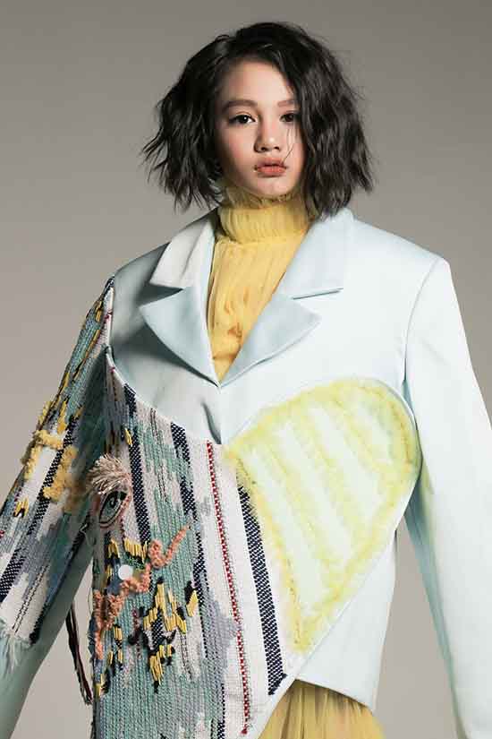 Mẫu blazer bất đối xứng trở nên độc đáo hơn bởi cách phối hợp chất liệu vải tweed cùng họa tiết thêu tay thủ công.