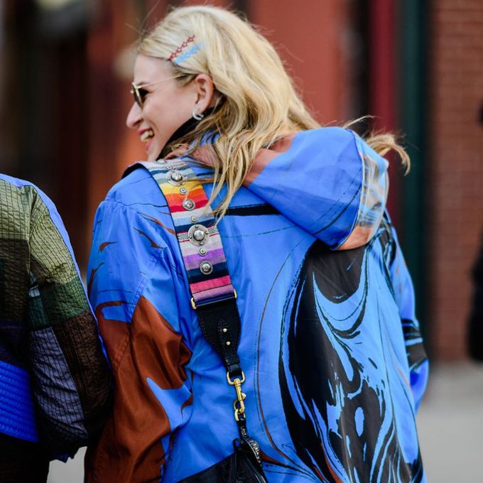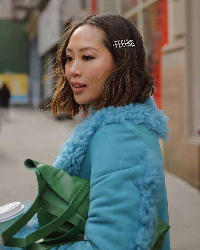 Xuất hiện tại New York Fashion Week Thu Đông 2019, fashionista Aimee Song tạo điểm nhấn cho mái tóc ngắn với kẹp tóc to bản gắn kết thành chữ ‘FEELINGS’.