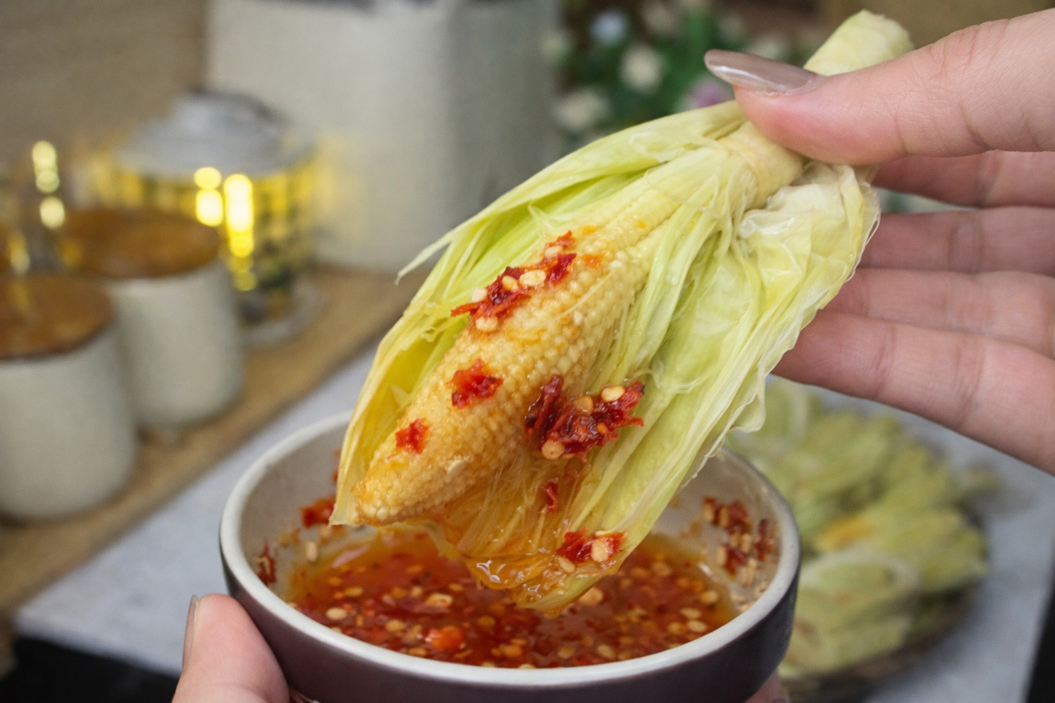 Bắp bao tử được thu hoạch sớm nên lõi mềm, vỏ non giòn. Luộc nguyên vỏ giúp giữ hơi nước và vị ngọt thấm vào lõi, ngon hơn cách bóc vỏ – Ảnh: Internet