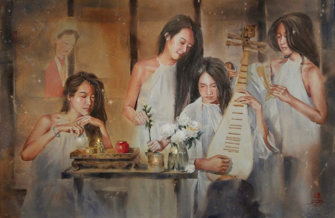 Chất liệu màu nước, với tính chất khó kiểm soát và đòi hỏi sự tiết chế cao, trở thành lựa chọn gắn bó lâu dài của Phan Anh Thư không phải là điều ngẫu nhiên. Đây là chất liệu đầu tiên cô đối diện, đồng thời cũng là nỗi sợ lớn nhất khi mới bước vào hội họa. Thế nhưng, chính sự mong manh, nhẹ nhàng nhưng giàu nội lực của màu nước lại phản chiếu đúng tinh thần sống mà Thư theo đuổi: mềm mại nhưng không yếu đuối, lặng lẽ mà bền bỉ.