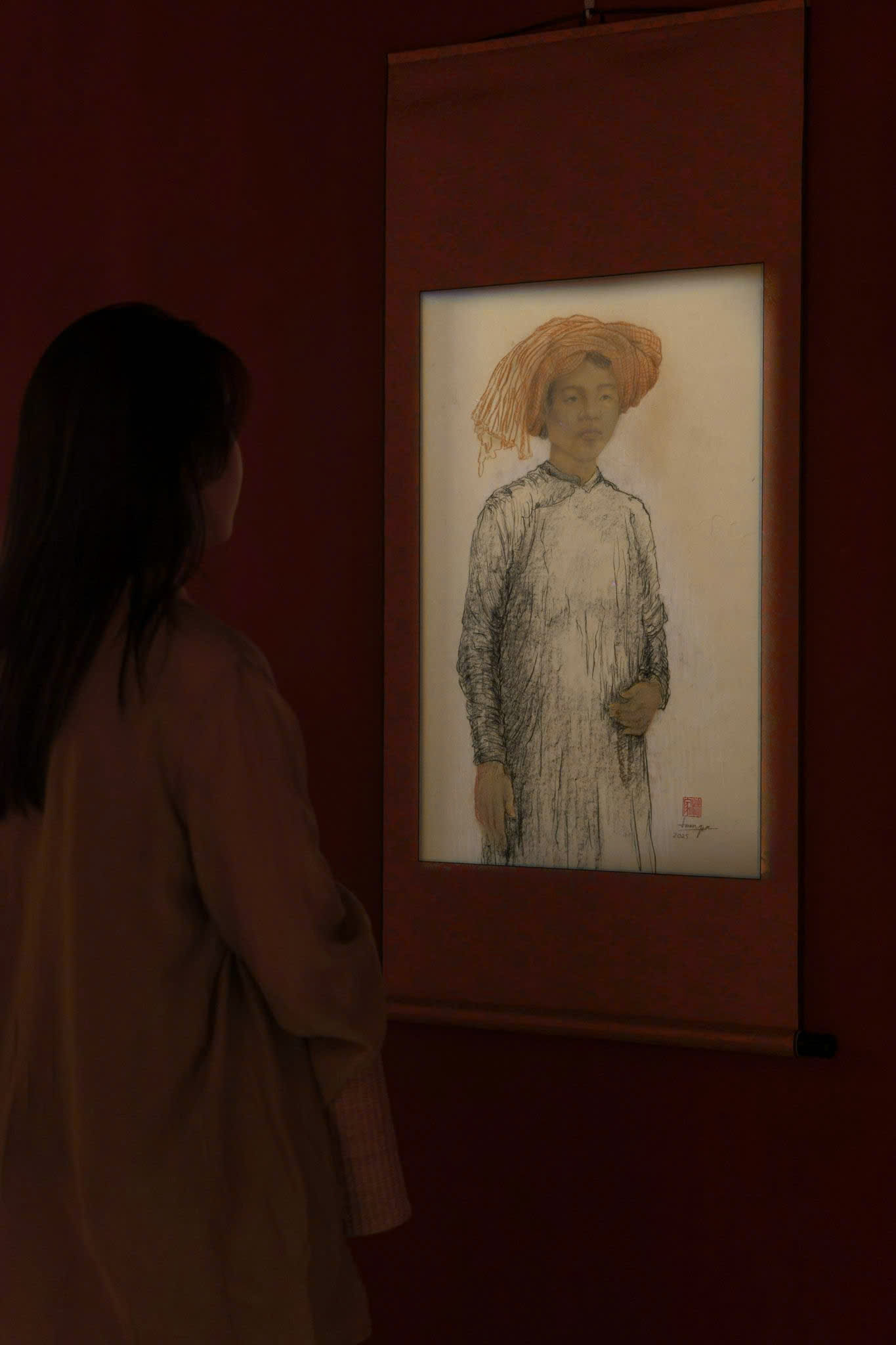 Anh xử lý chất liệu lụa theo cách vừa giữ lại sự mềm mại nguyên bản, vừa tạo chiều sâu bằng những lớp màu mỏng. Bảng màu ấm, tiết chế cùng bố cục tinh giản mang đến không gian gợi nhớ, nơi người xem có thể tự tìm thấy câu chuyện của chính mình. Với Huấn, lụa Việt không chỉ là chất liệu truyền thống, mà còn là cánh cửa để bước vào dòng chảy nghệ thuật đương đại.