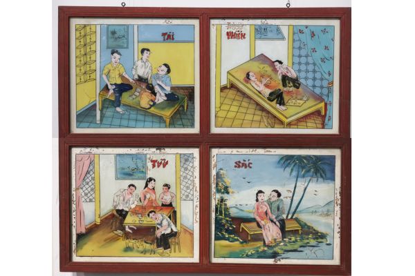 Bộ bốn bức tranh với chủ đề Tứ đổ tường (Tài – Phiến – Tửu – Sắc) mang đậm những nét đặc trưng Nam Bộ do nhà sưu tầm Nguyễn Duy mang đến. Bộ bốn bức tranh nói về những thói quen xấu có thể dẫn đến những hậu quả khôn lường là tan nhà nát cửa: Cờ bạc, rượu chè, trai gái, hút chích.