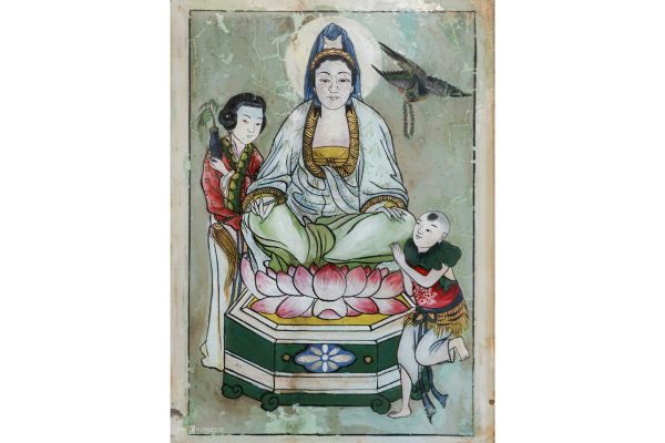 Bức tranh kính “Quan Âm Bồ Tát” được vẽ từ năm 1920. Có thể nói đây là tác phẩm xưa nhất được tìm thấy trong một ngôi miếu trên đường Nguyễn Thái Bình, quận 1.