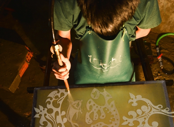 Họa sĩ tạo hình tác phẩm bằng vòi xịt nước áp lực, công đoạn quan trọng mang đến sự độc đáo khác biệt trong mỗi bức tranh.