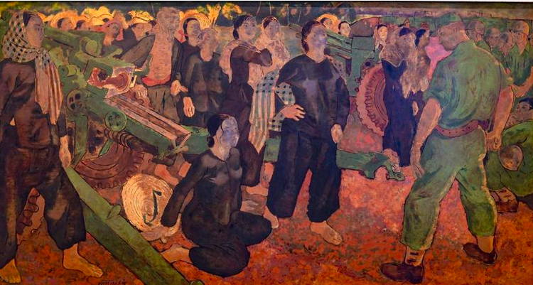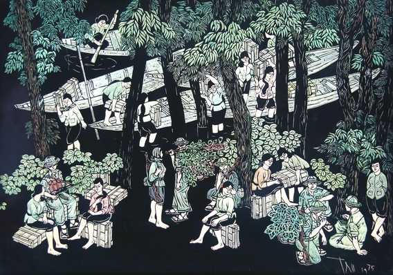 Một tác phẩm khác cũng thú vị không kém, bằng chất liệu sơn mài, mang tên Tải đạn của họa sĩ Lê Thanh Trừ, vẽ năm 1975. Bức vẽ nói về hình thức chở vũ khí bằng thuyền ba lá trên sông nước Nam Bộ. Trong đó còn là hình ảnh nữ dân quân lội nước chuyển vũ khí vào bờ. Những lời nói chuyện như râm ran của nữ dân quân với bộ đội trong lúc tạm nghỉ được họa sĩ miêu tả rất tinh tế trong bức vẽ.