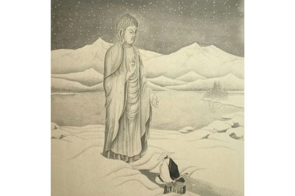 Bức “Đại tuyết” minh họa cho các câu thơ “Tuyết đã xuống rồi/ Mau mang tượng Phật/ Chẻ làm củi thôi” của tu sĩ Pháp Hoan được vẽ trên giấy Fabriano Artistico 300gsm và được nhuộm thủ công.