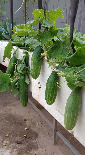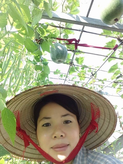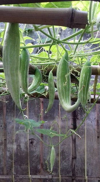 Ngoài bí dưa hấu, bầu hồ lô, chị Thu Huyền trồng đậu cô ve, mướp ta, mướp rắn (mướp Nhật quả dài). Nhờ kinh nhiệm nhiều năm trồng rau mặt đất và trồng rau sân thượng, giống nào chị chăm sóc cũng sai trĩu. Giống mướp rắn hình thù lạ mắt và cách chăm sóc đơn giản. Bà mẹ hai con tưới nước hai lần vào sáng sớm và chiều mát.
