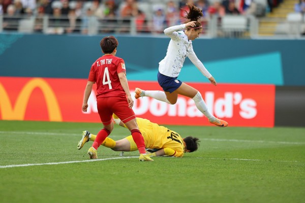 Ở phút bù giờ thứ 7 của hiệp 1, đội tuyển nữ Mỹ tiếp tục làm rung lưới đội tuyển nữ Việt Nam. Ban đầu trọng tài biên phất cờ báo Morgan đã việt vị, nhưng sau khi VAR vào cuộc, tiền đạo mang áo số 13 được xác định không tham gia vào pha bóng.