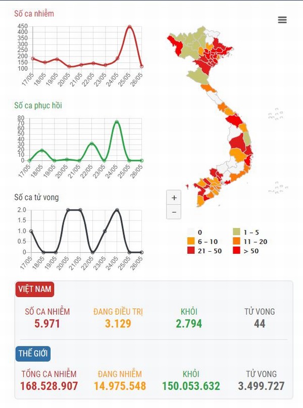 Tính đến thời điểm hiện tại, Việt Nam có tổng cộng 5971 ca mắc COVID-19, trong đó có 3.129 ca đang điều trị và 44 ca tử vong. Trên toàn thế giới có 168.528.907 ca nhiễm, trong có đã chữa khỏi 150.0530632 nhưng có đến 3.499.727 ca tử vong.
