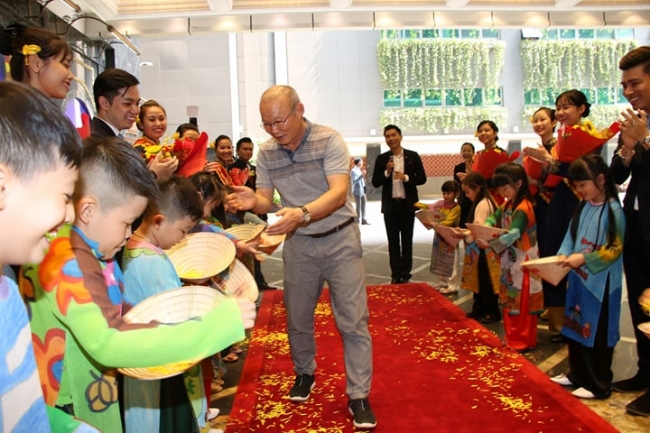 HLV Park Hang-seo được các em nhỏ chào đón khi bước vào buổi giao lưu