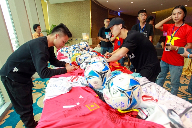 Người hùng Quang Hải và Công Phượng ký tên lên vật phẩm dành tặng người hâm mộ trong buổi giao lưu