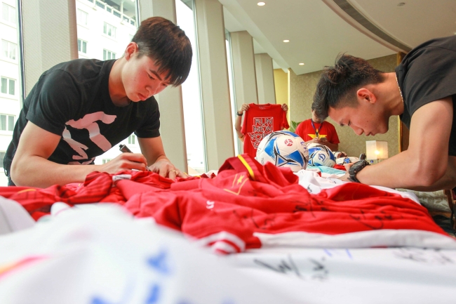 Bộ đôi hậu vệ của Hà Nội FC, Duy Mạnh và Văn Hậu ký tên lên vật phẩm