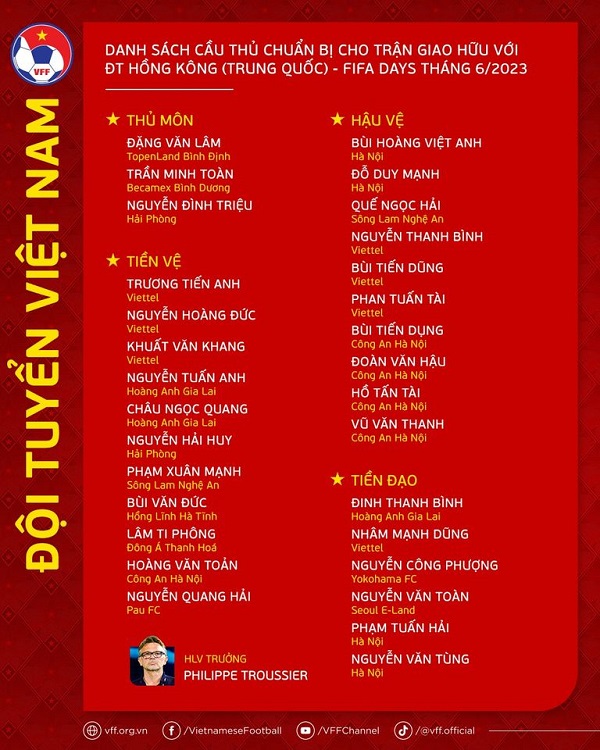 Trước đó, cũng đã có 2 cầu thủ nói lời chia tay ĐT Việt Nam vì lý do chấn thương là Nguyễn Phong Hồng Duy và Nguyên Mạnh. Hiện tại, HLV Troussier còn lại trong tay khoảng 30 cầu thủ, trong đó có 4 cầu thủ được đôn lên đội U.23 là Khuất Văn Khang, Nguyễn Văn Tùng, Hoàng Văn Toàn và Phan Tuấn Tài.