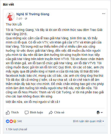 Nội dung xin lỗi được diễn viên Trường Giang đăng trên Fanpage như sau: