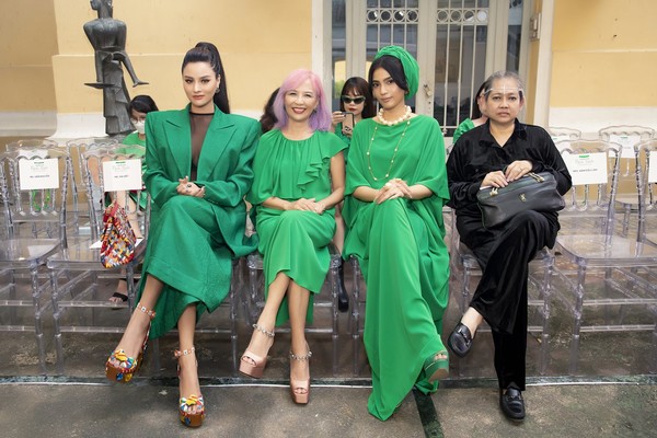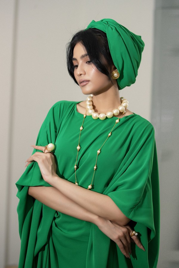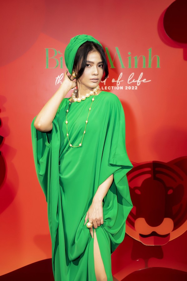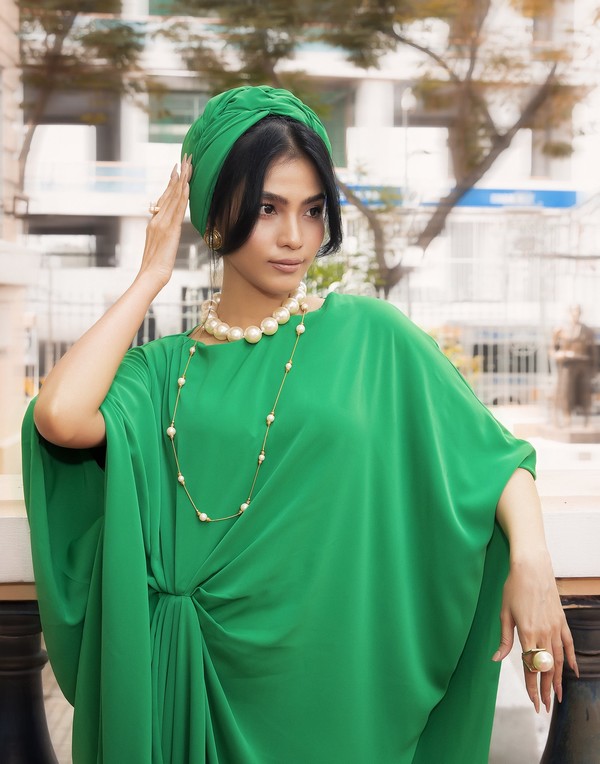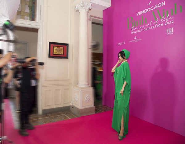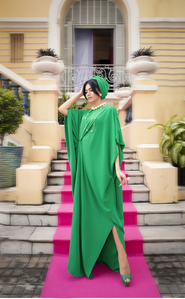 Được biết đây là bộ trang phục của bộ đôi NTK Vũ Ngọc Son chọn riêng cho Trương Thị May để diện tại sự kiện thời trang này. Bộ đầm xanh “ăn ý” với chiếc khăn quấn tóc tạo điểm nhấn vừa quyến rũ vừa sang trọng.