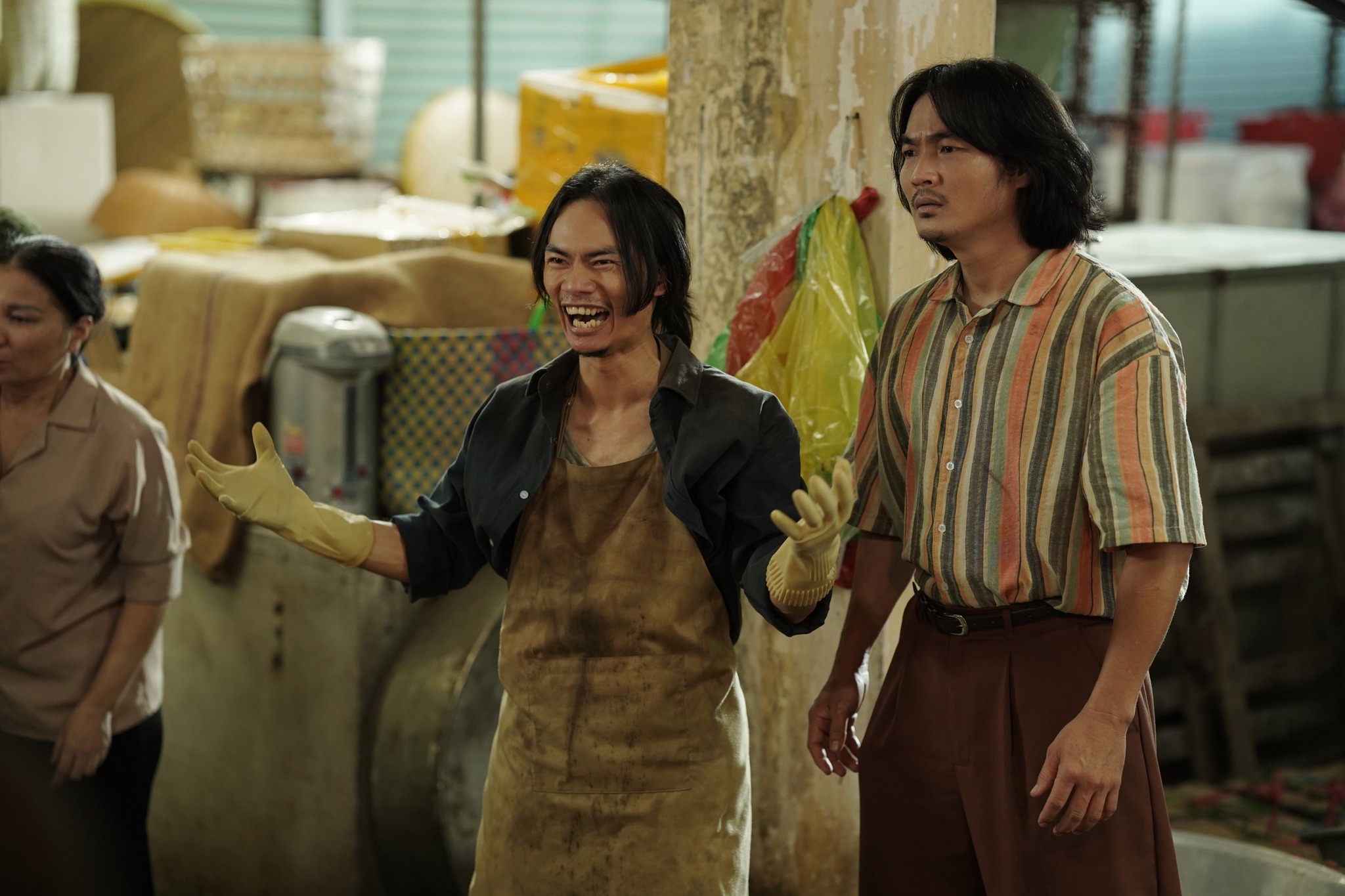 Đạo diễn hành động Hoàng Tóc Dài (bên trái, vai Hoàng) duyên dáng xuyên suốt cả bộ phim - Ảnh trích từ phim