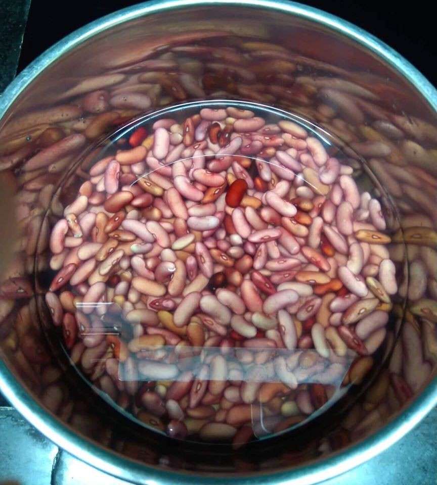 Đậu đỏ rửa sạch, ngâm nước 6-8 tiếng. Sau đó cho đậu đỏ, muối và nước (mực nước ngập đậu) vào ninh cho chín nhừ.